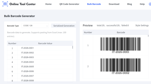 ExcelまたはCSVから複数のバーコードをバルクで生成します。コード 128、EAN-13、UPC-A、および印刷準備ができるエクスポートフォーマットをサポートする無料のオンライン複数バーコードジェネレータ。